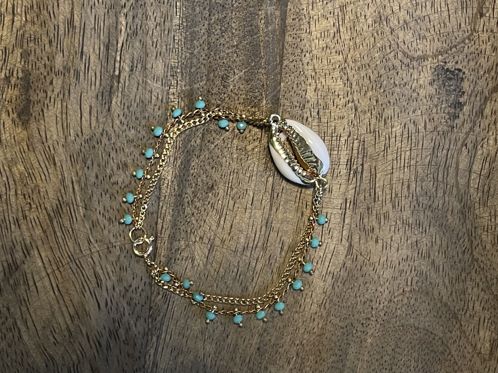 Chaîne en laiton brut perles facettées turquoise, coquillage naturel avec dorure.