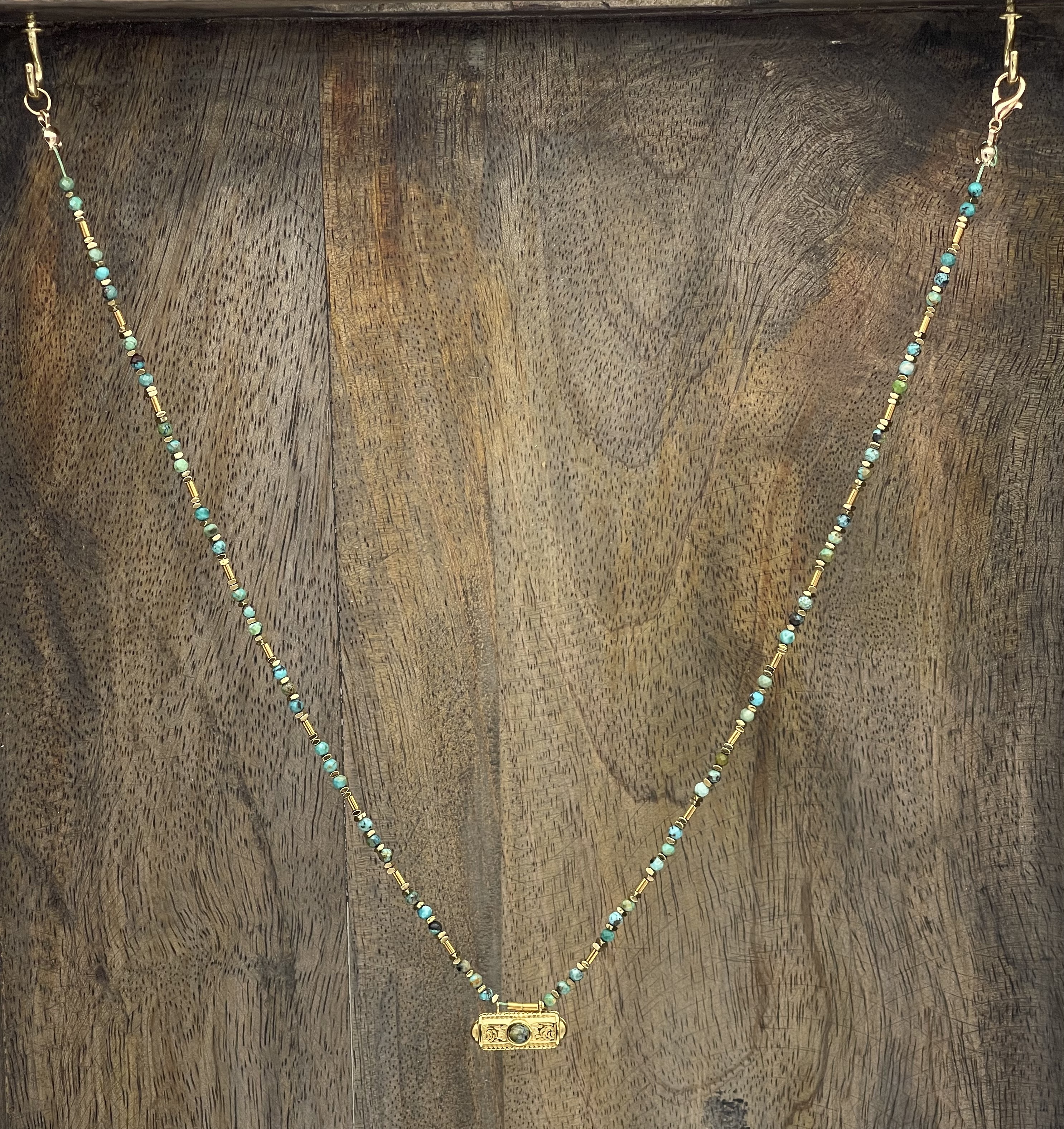 Perles turquoise africaine, miyuki doré à l’or fin, hématites dorées, pendentif en laiton doré à l’or fin avec perle turquoise.