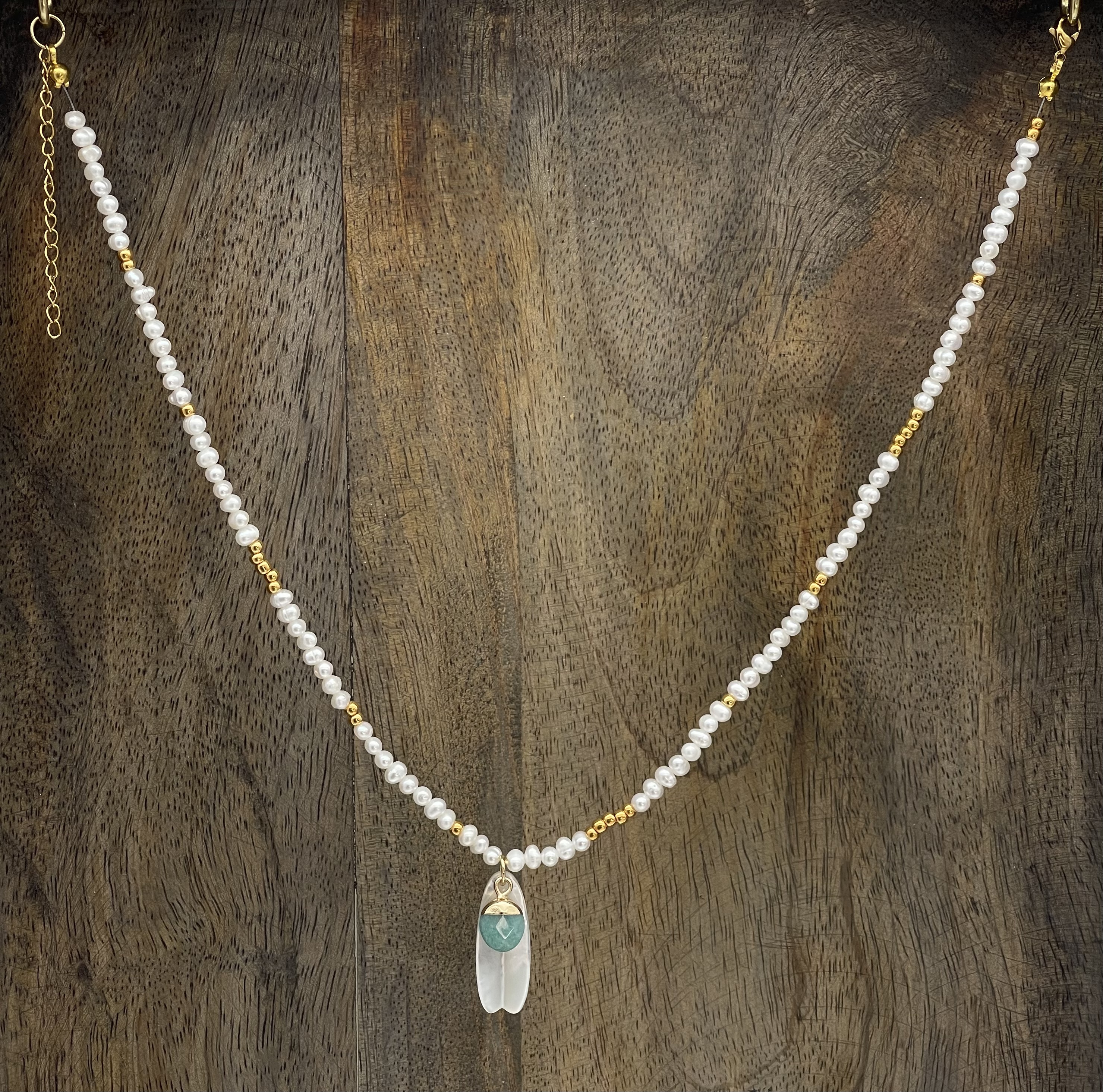 Perles d’eau douce, miyuki dorées à l’or fin, pendentif nacre et turquoise.