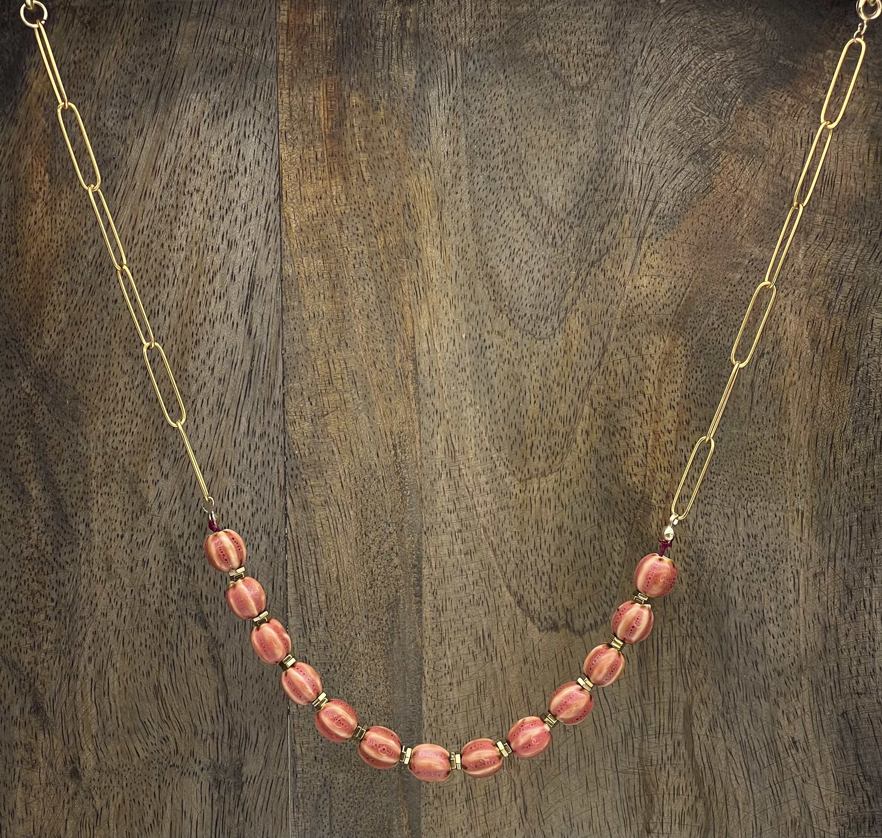 Perles de céramique de couleur ocre, hématites dorées façonnées, chaine acier dorée. Monté à la main.