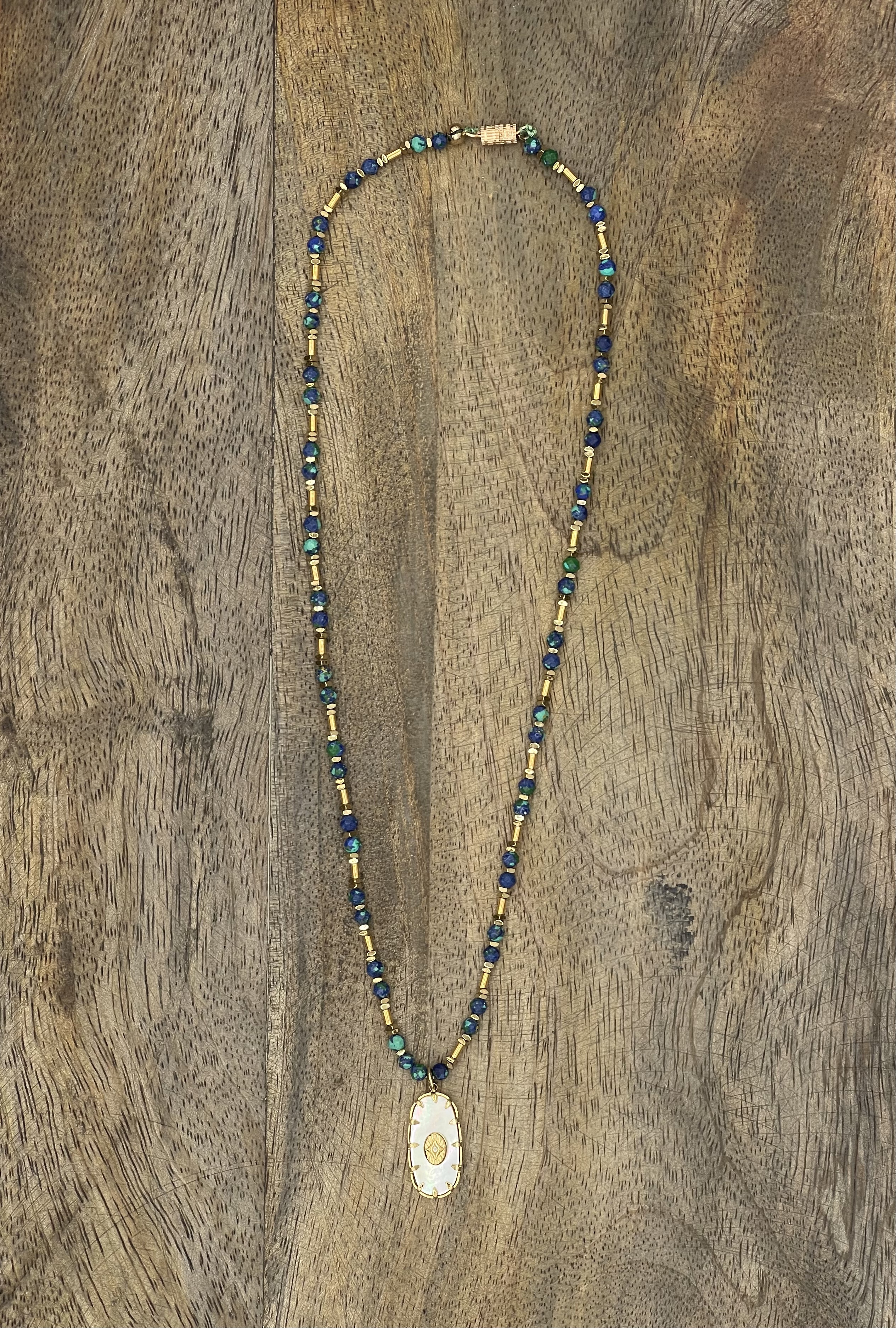 Perles Lapis Lazuli, tubes en laiton doré à l’or fin, hématites dorées, pendentif nacre doré à l’or fin.