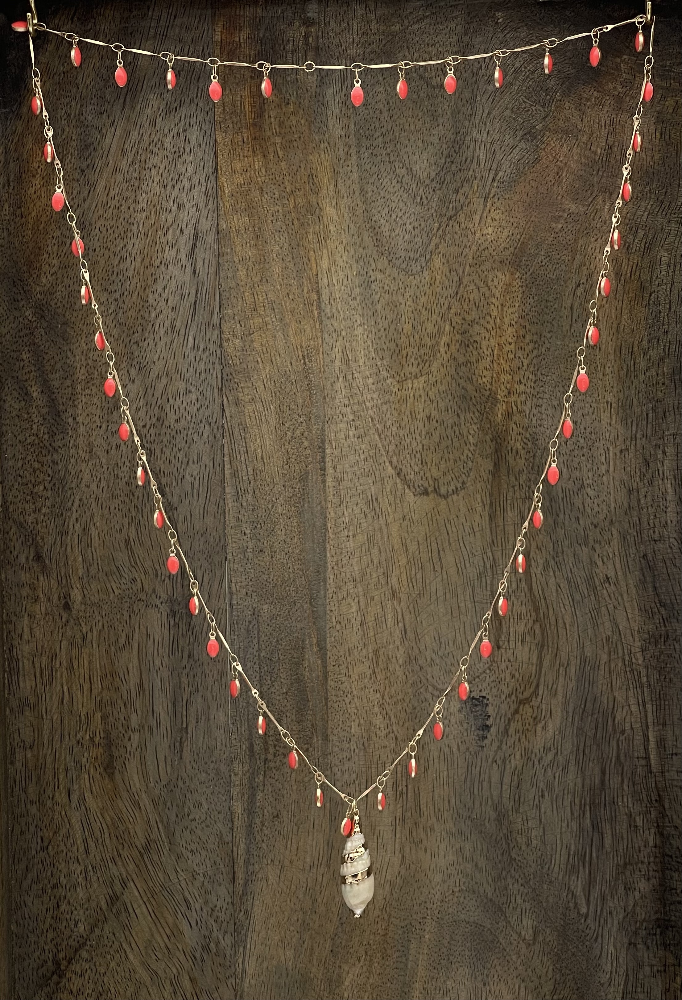 Chaine laiton doré avec pendants émaillés corail, coquillage naturel avec dorure