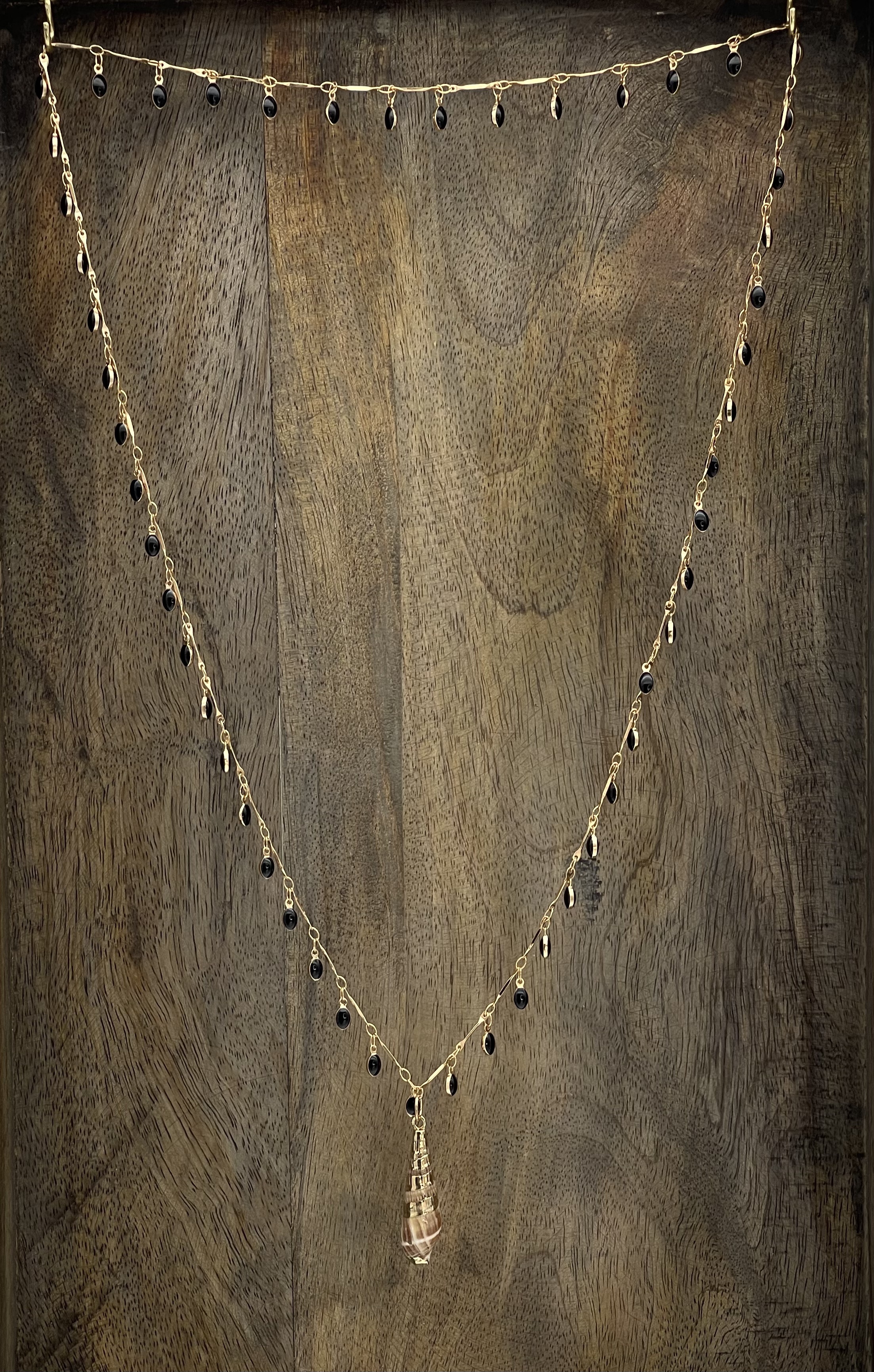 Chaine laiton doré avec pendants émaillés noirs, coquillage naturel avec dorure